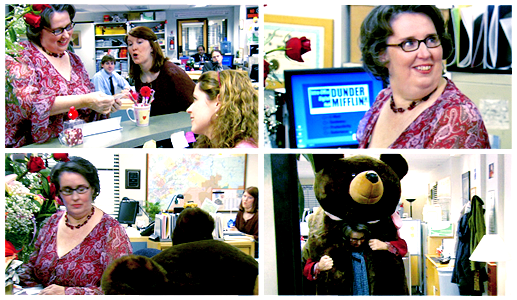 - A brief synopsis – It’s Valentine’s Day at the office, and Phyllis is inundated with many lavish gifts from Bob Vance, of Vance Refrigeration. Pam, under the illusion that Roy won’t get her something too big, sees her hopes erode throughout the day. Kelly and Ryan, hooking up the previous night, now have all the awkwardness compounding with the pressure of the lover’s holiday. Dwight and Angela give each other some significant gifts. Jim…just watches Pam in misery. Michael, meanwhile, has been called to New York to give a financial presentation to new CFO David Wallace. In the trip, he manages to insinuate that he is going out with Jan to the other managers, and when this is revealed, he has some backpedaling to do. Backpedaling done, Jan gives him another seductive kiss and then notices the camera.