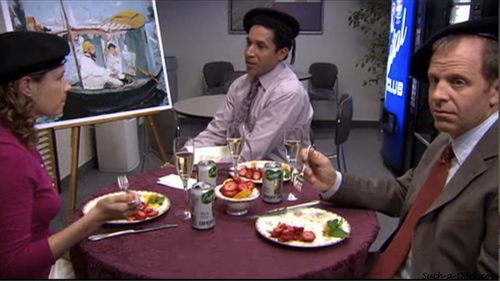- A brief synopsis – Stanley makes like he’s going to Nashua to work for Karen, so Michael declares war on the branch, taking Dwight and Jim with him to play a prank on them. Pam and Oscar, then Toby, form The Finer Things club, where they discuss books and art once a month, while Andy sits in the periphery, wanting to join.