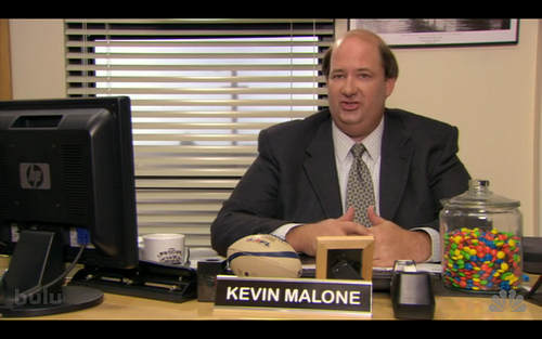 - The best moment – Kevin gets Pam and Jim’s card cancelled on their honeymoon.