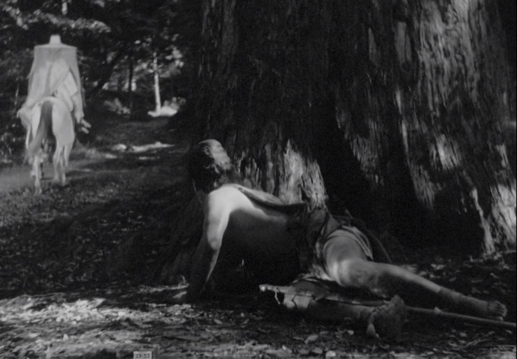 The bandit (Mifune) is a whimsically menacing legend, and when he sees the wife being guided atop a horse, he sees the light of her goodness and he wants to consume her entirely. He deceives the husband, ties him up and makes him watch as he attacks and rapes his wife. This taking place in the 8th Century, the sin becomes the woman’s at the moment she is taken. If one gets lost in this obvious injustice, they risk the chance at understanding a deeper concept.