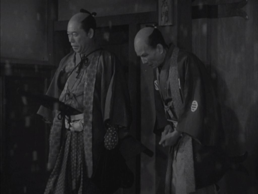 Mifune and Shimura are both fantastic in this story. One is given the sense of marching towards despair as the two ponder their fate. Shimura’s Jinza is more accepting of his role as a defender. He is at peace because he does not have to be the aggressor. Mifune, learning from his mentor (Shimura) a sense of subtlety, is able to further his effectively obvious passion through restraint. Even without words, we understand both perfectly.